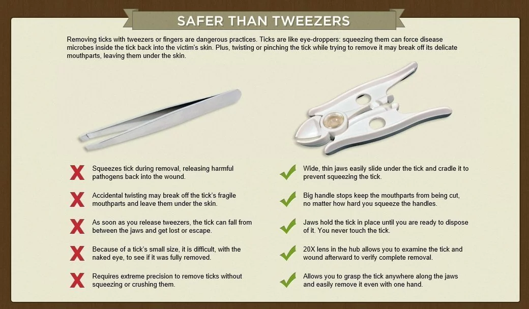 This patented tick-removing pliers removes any size tick more simply and safely than any other method. By sliding under the tick without squeezing or cutting, it grips firmly without breaking the mouth parts. Tick nipper comes with a built in 20X lens to help identify the small, dangerous deer tick on skin or clothes.