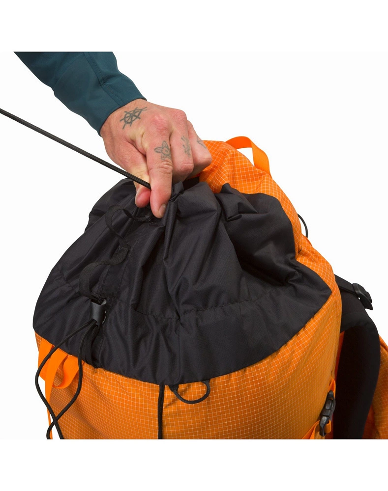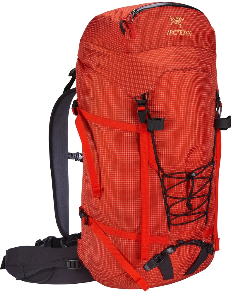 Arc’teryx developed its own fabric to achieve the hardwearing durability necessary for alpine and rock climbing. Prioritizing abrasion and tear resistance, a liquid crystal polymer ripstop grid is incorporated in a high tenacity nylon fabric. Extremely versatile, customizable options suits the needs of varied alpine adventures. A removable framesheet and an adjustable, removable top lid give the option to shed weight. Custom webbing daisy chains securely lash gear and ice pick capture accommodates a range of angles