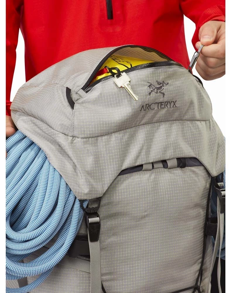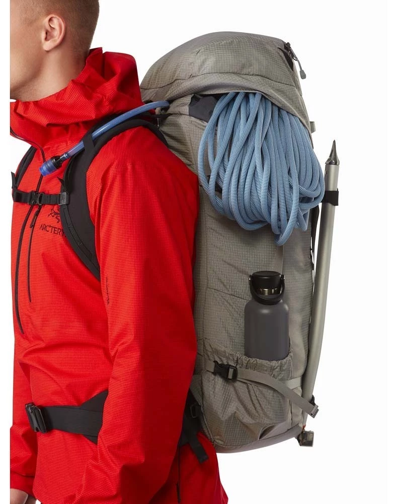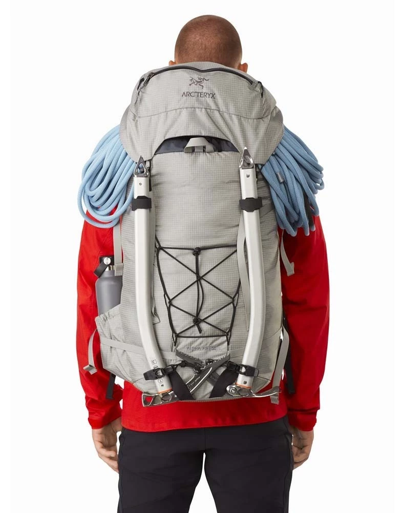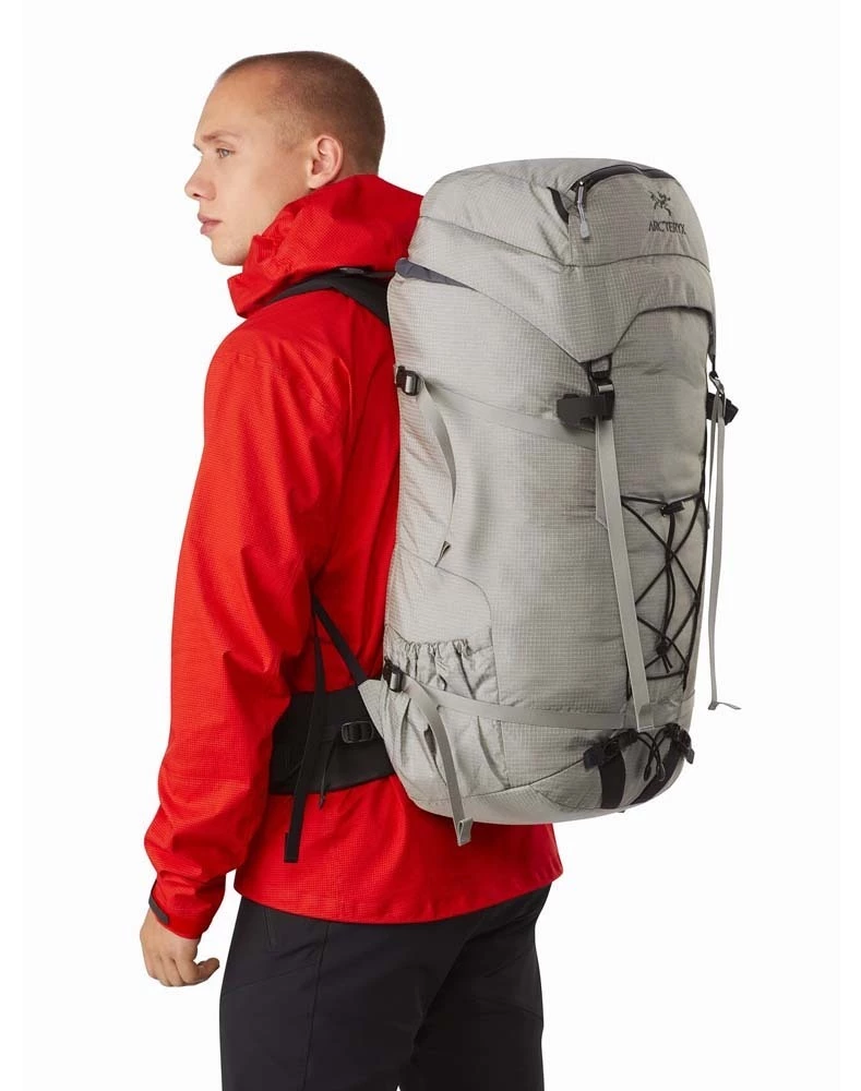 Durable and versatile all-round pack for ice climbing and multi-day alpine climbs. Alpha Series: Climbing and alpine focused systems. Arc’teryx developed its own fabric to achieve the hardwearing durability necessary for alpine and rock climbing. Prioritizing abrasion and tear resistance, a liquid crystal polymer ripstop grid is incorporated in a high tenacity nylon fabric. Extremely versatile, customizable options and a large 55L capacity suits the needs of multi-day alpine adventures. A removable framesheet and an adjustable, removable top lid give the option to shed weight. Custom webbing daisy chains securely lash gear and ice pick capture accommodates a range of angles.