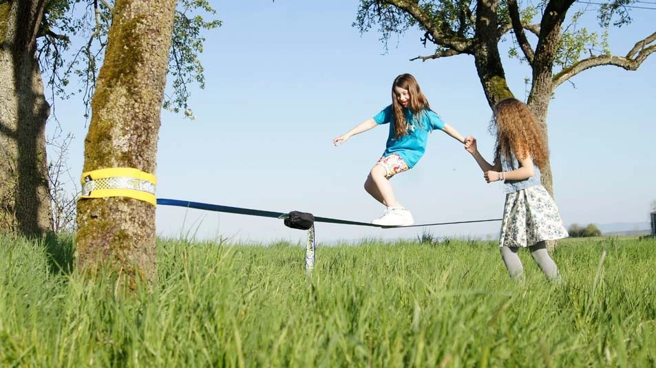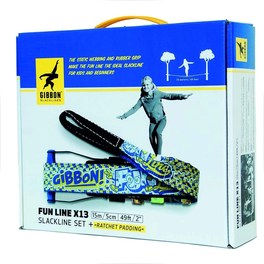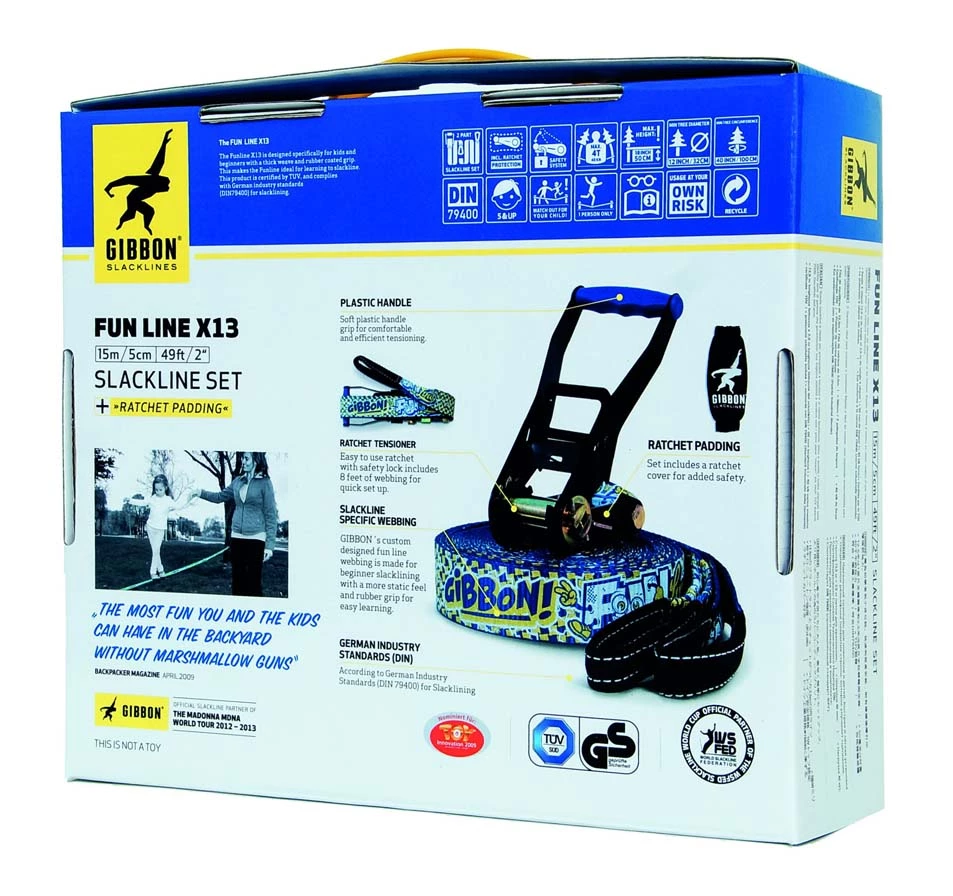 The Gibbon Fun Line X13 Slackline is Ideal for kids of all ages and families. Easy assembly and a low setup height, as well as a rubber coated print, are the key benefits of this set. The rubber coating makes it easier for little feet and beginners to have more hold when walking. It guarantees 100% fun! Naturally TUV approved.