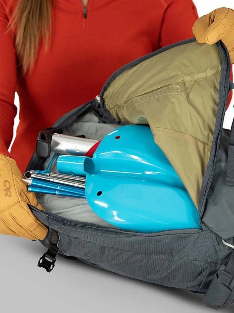 - Large front panel J-zip access to avalanche safety kit pocket with shovel handle and probe sleeves