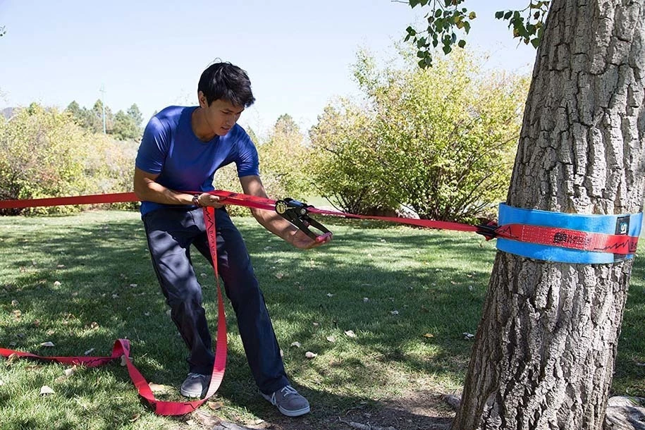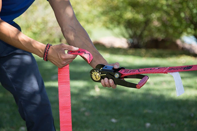 The easy-to-use ratchet comes with 2.4m / 8 feet of webbing and a reinforced loop to firmly anchor and tension the slackline. The handle grip is a soft plastic for comfortable and efficient tensioning and the ratchet release is also rubberized for easy and safe release of the tension on the line.